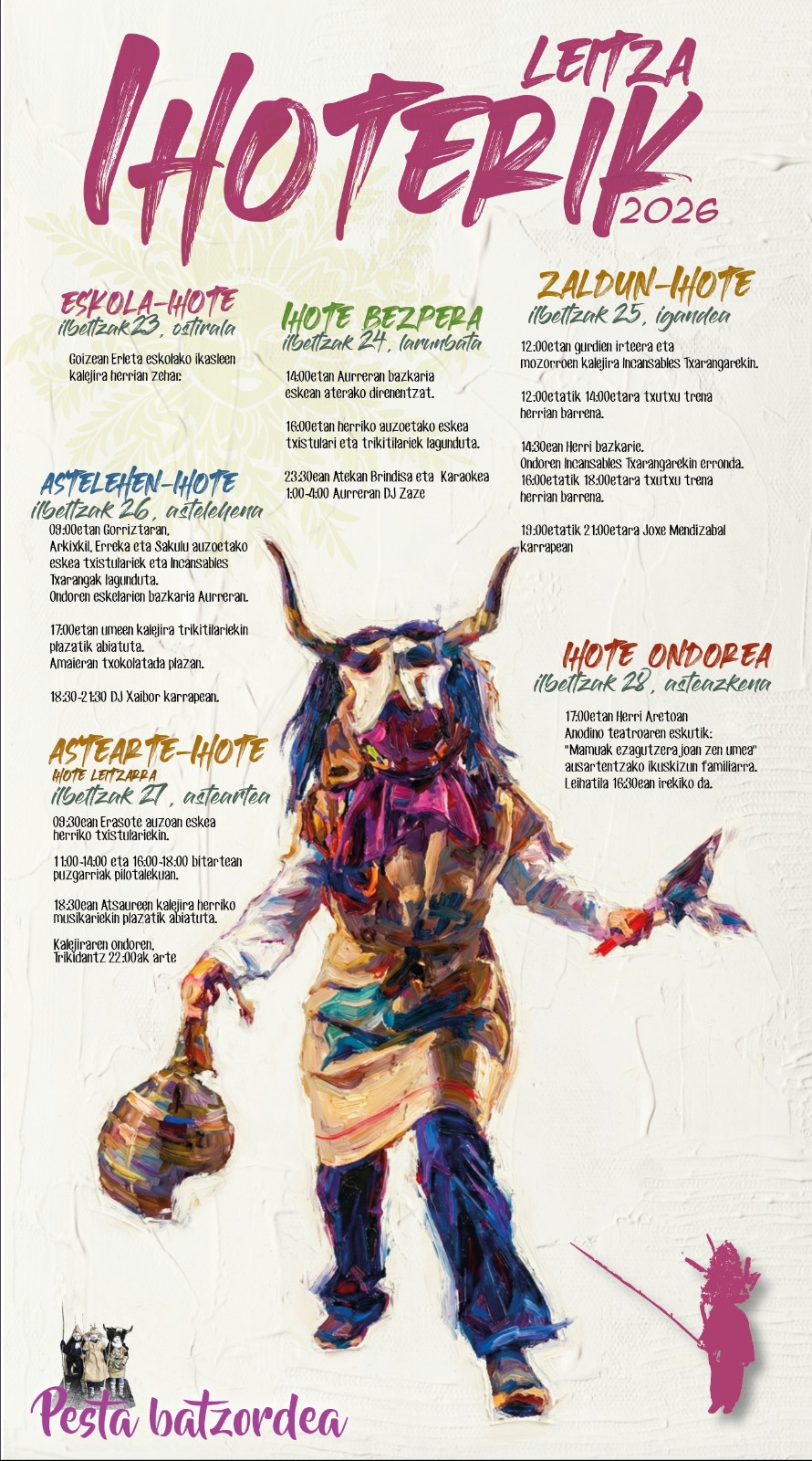 - 18:30 Desfile de los «atsaures» desde la plaza. Después de la kalejira, Trikidantz hasta las 22:00.
